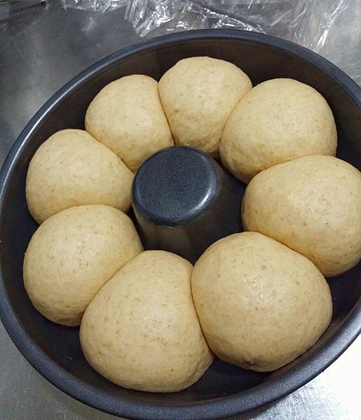 - 鬆弛完,再次將麵團壓扁排出空氣整圓,排排放到抹了奶油的烤模內,進行二次發酵45分鐘