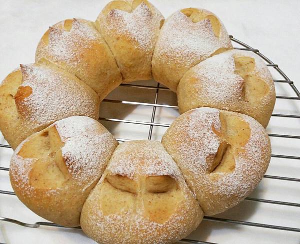 - 發酵完後可以選擇要不要在麵包上灑上高筋麵粉還有剪口作裝飾(黛芙妮純粹想要試試看有點變化會長怎樣:P